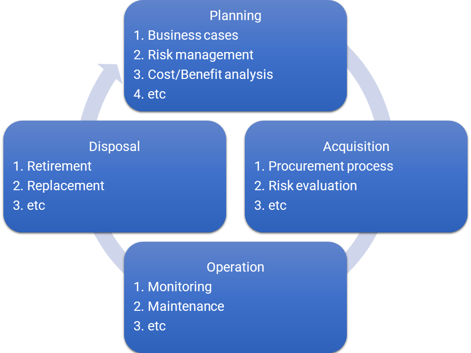 In other words, asset management defines processes and procedures for optimizing the return-on-investment (ROI) π° from assets across the four phases of their life-cycles.