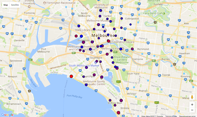I started today with a goal to plot data from Melbourne city particularly Melbourne Bike Share stations on google maps with marker size and color representing the size of the station and the availability of bikes respectively in addition to tooltips containing the details of each station on hover.