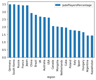 result_df.plot.bar(x='region', y='JudoPlayersPercentage')