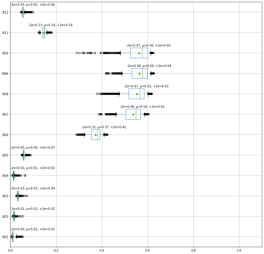 ax, bp = data[bands].boxplot(whis=[2.28, 97.72], vert=False, showmeans=True, figsize=(15,15), return_type="both")